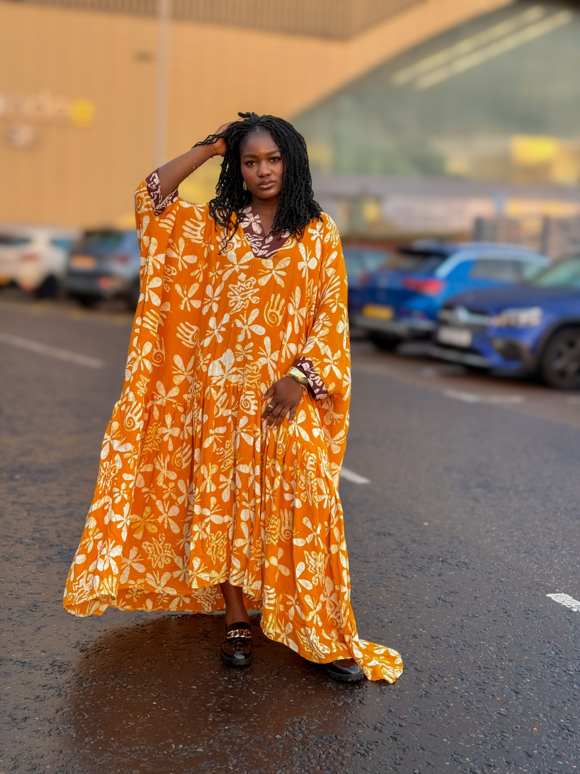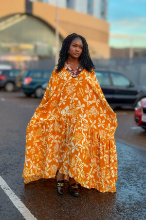 Hand-printed bubu dress with gathered hemline and inner pockets.