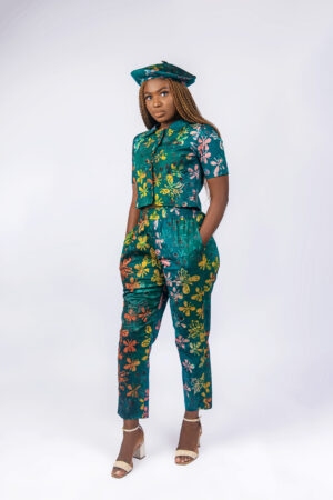 Green open-back butterfly print with trench beret 2-piece.