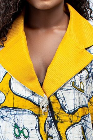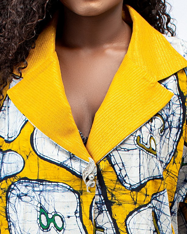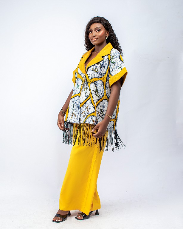 Kimono top with fringe hemlines and asooke collar and sleeve hem details.