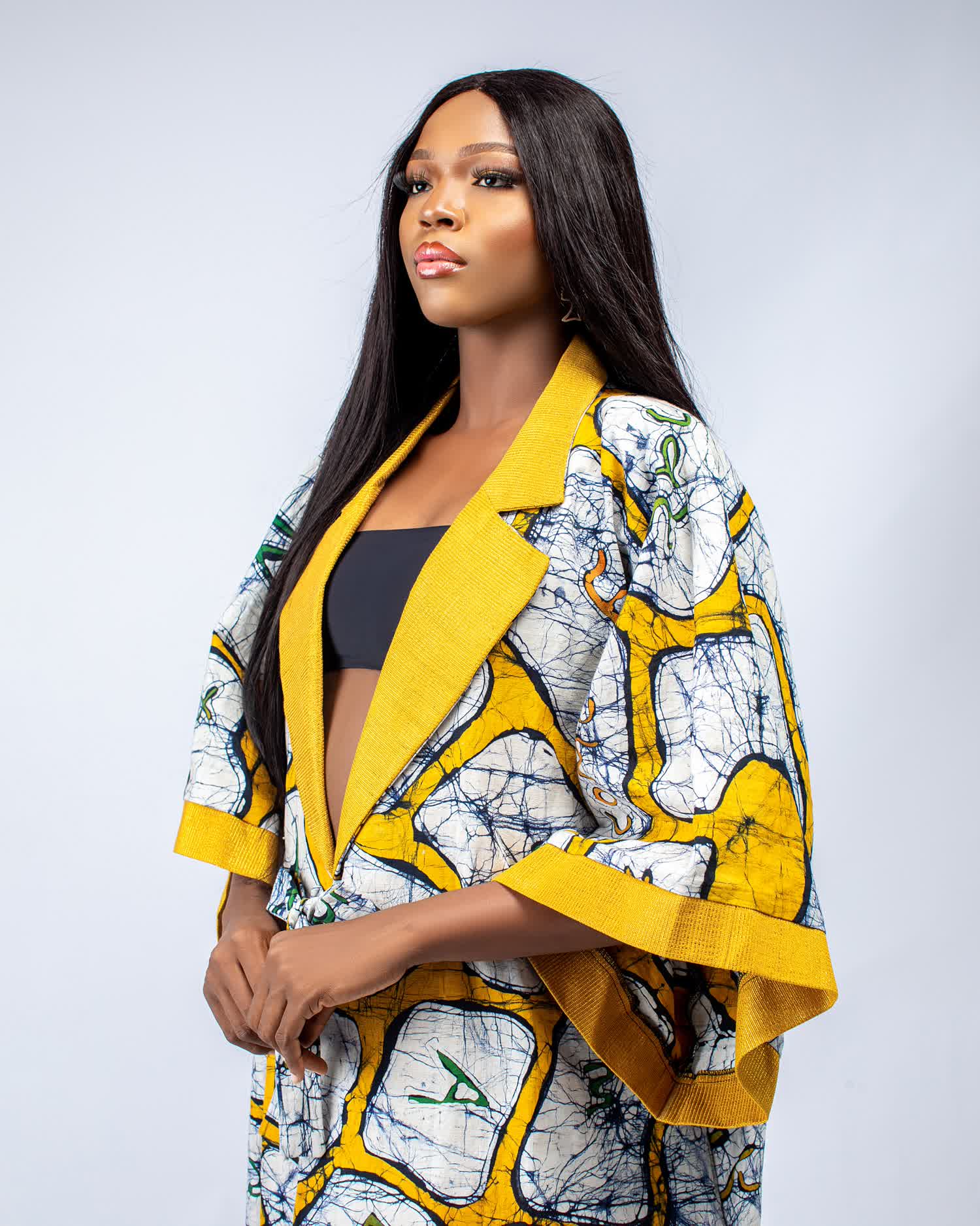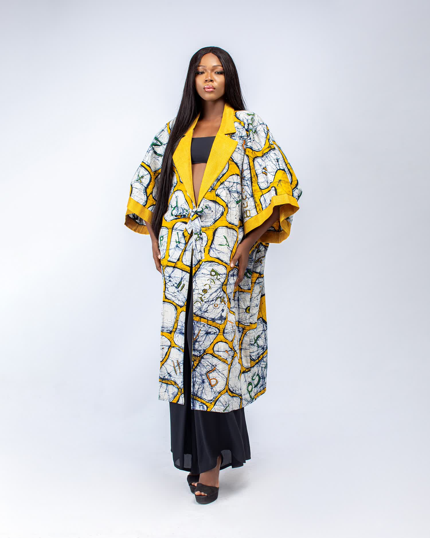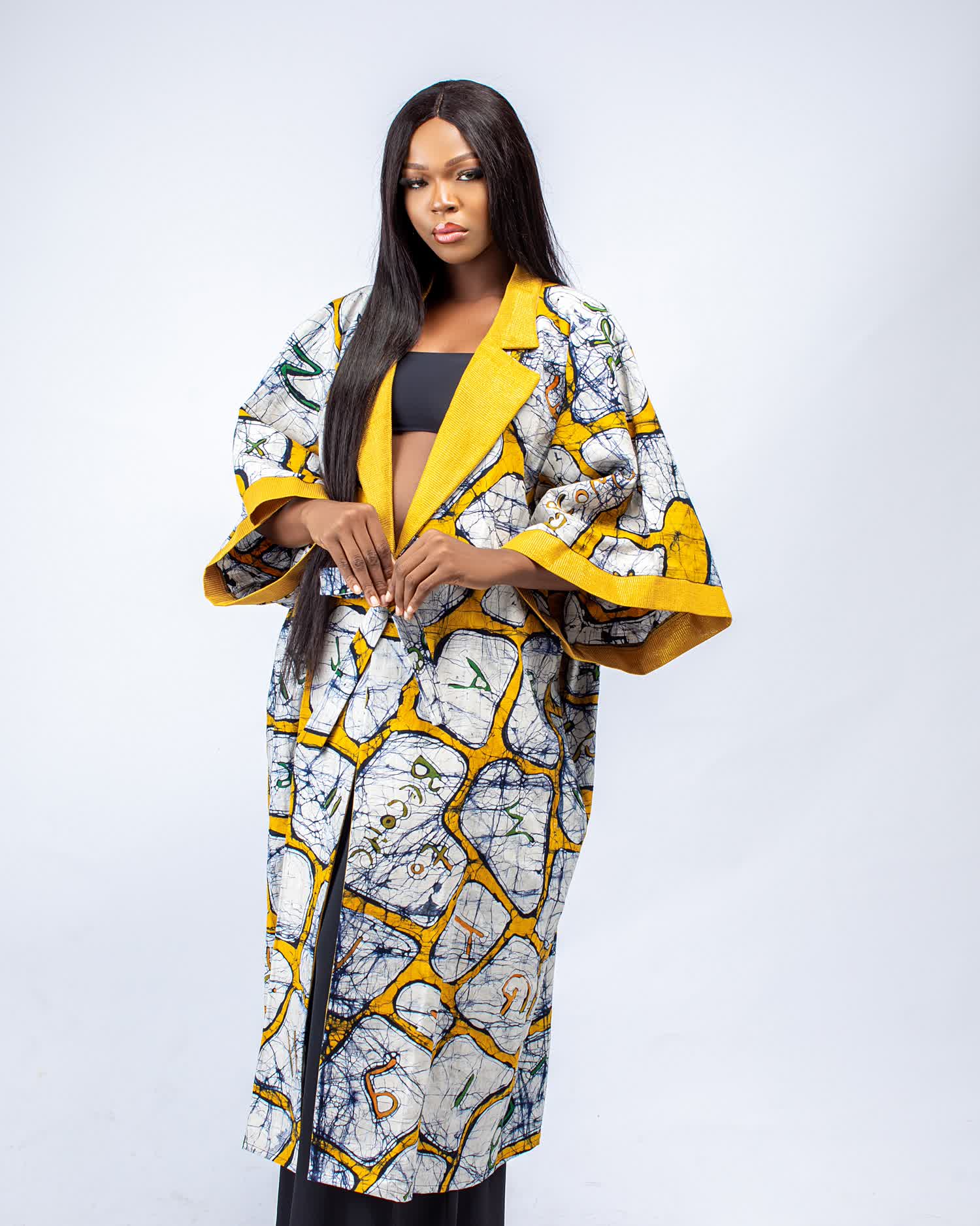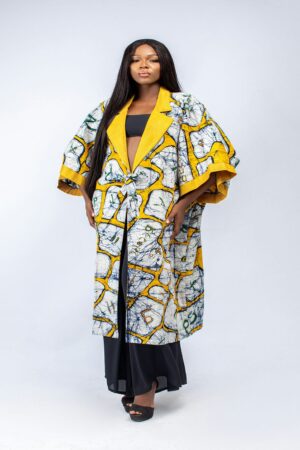Hand printed kimono with aso oke details on collar and sleeve band.