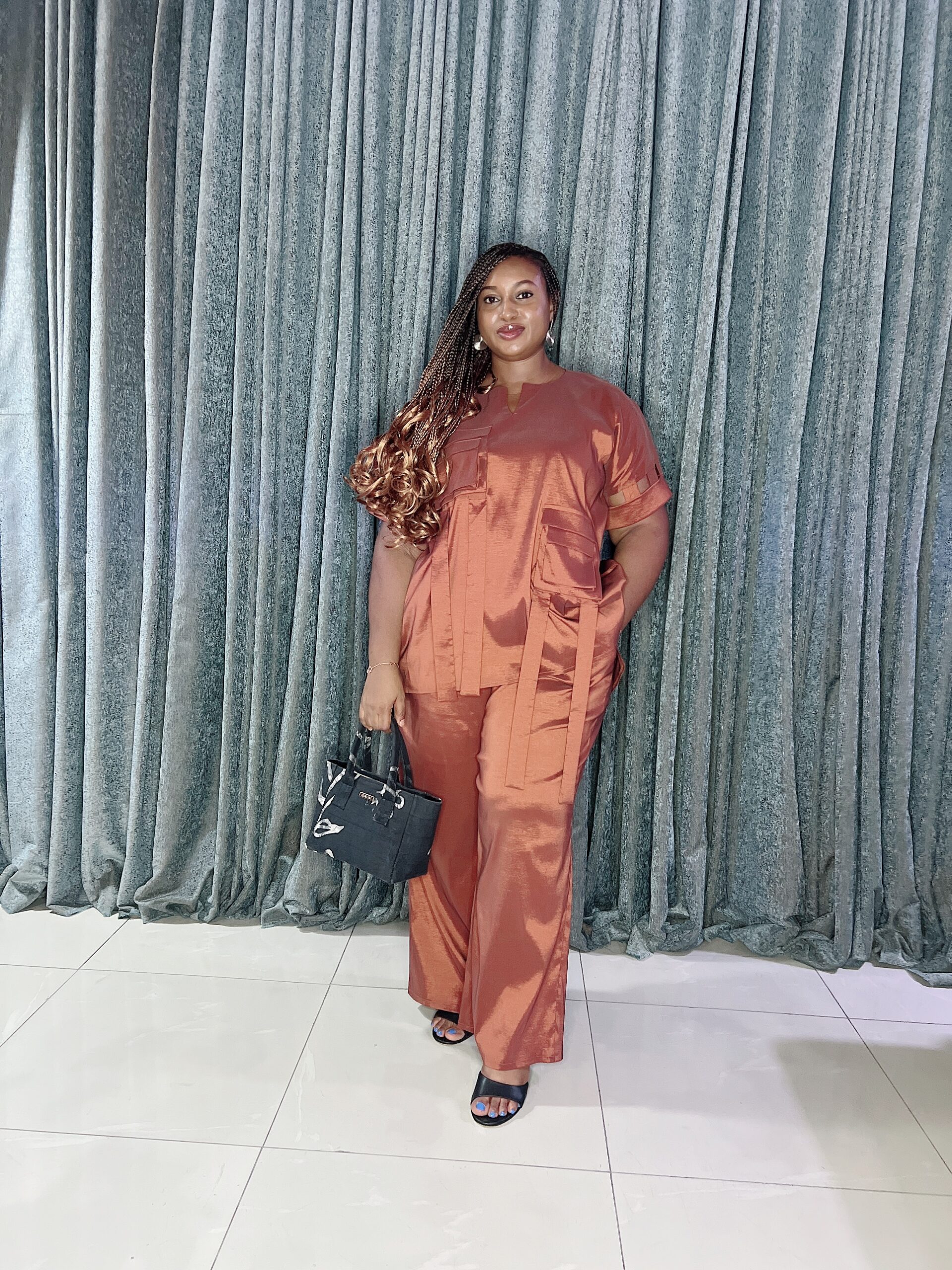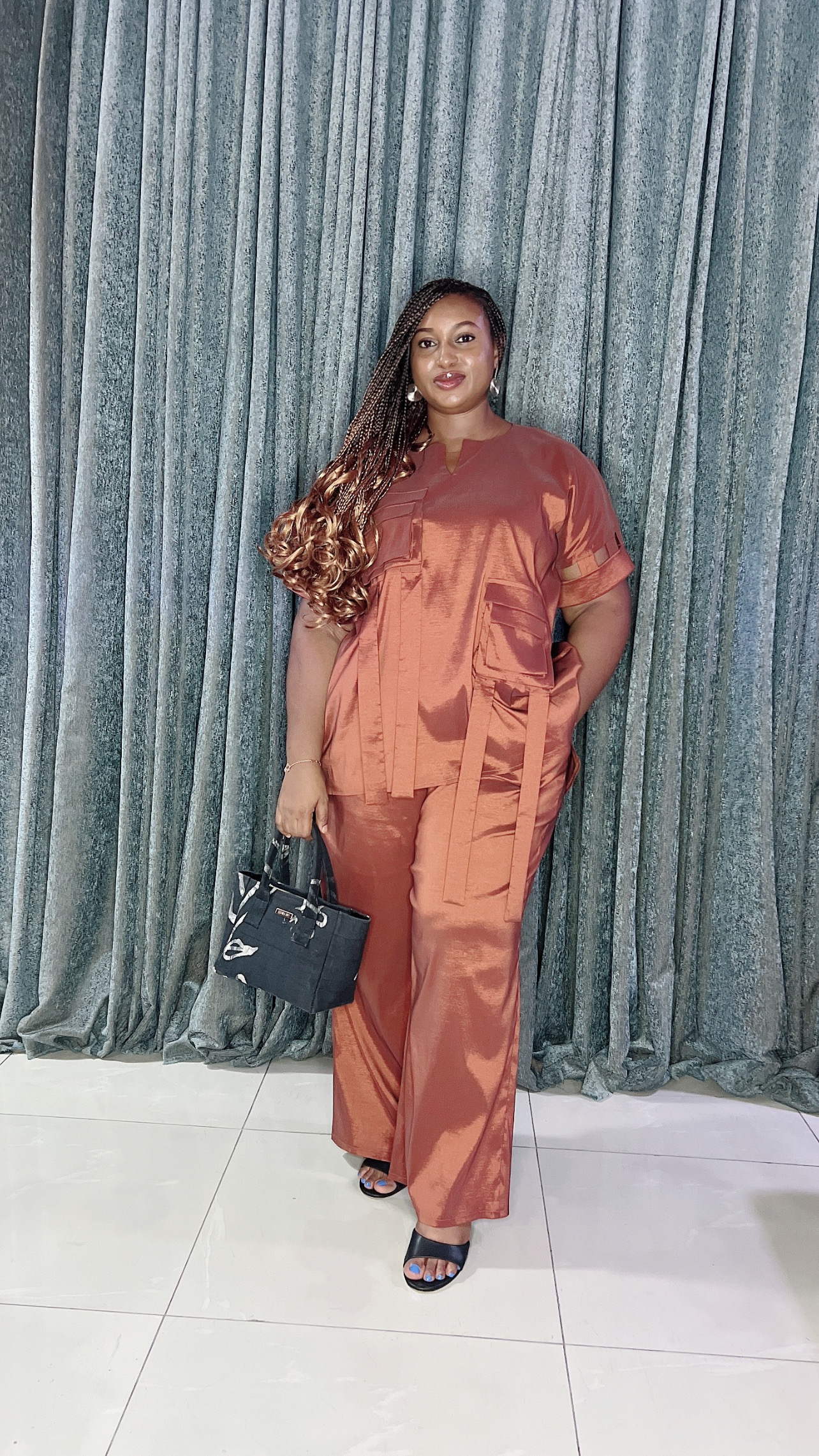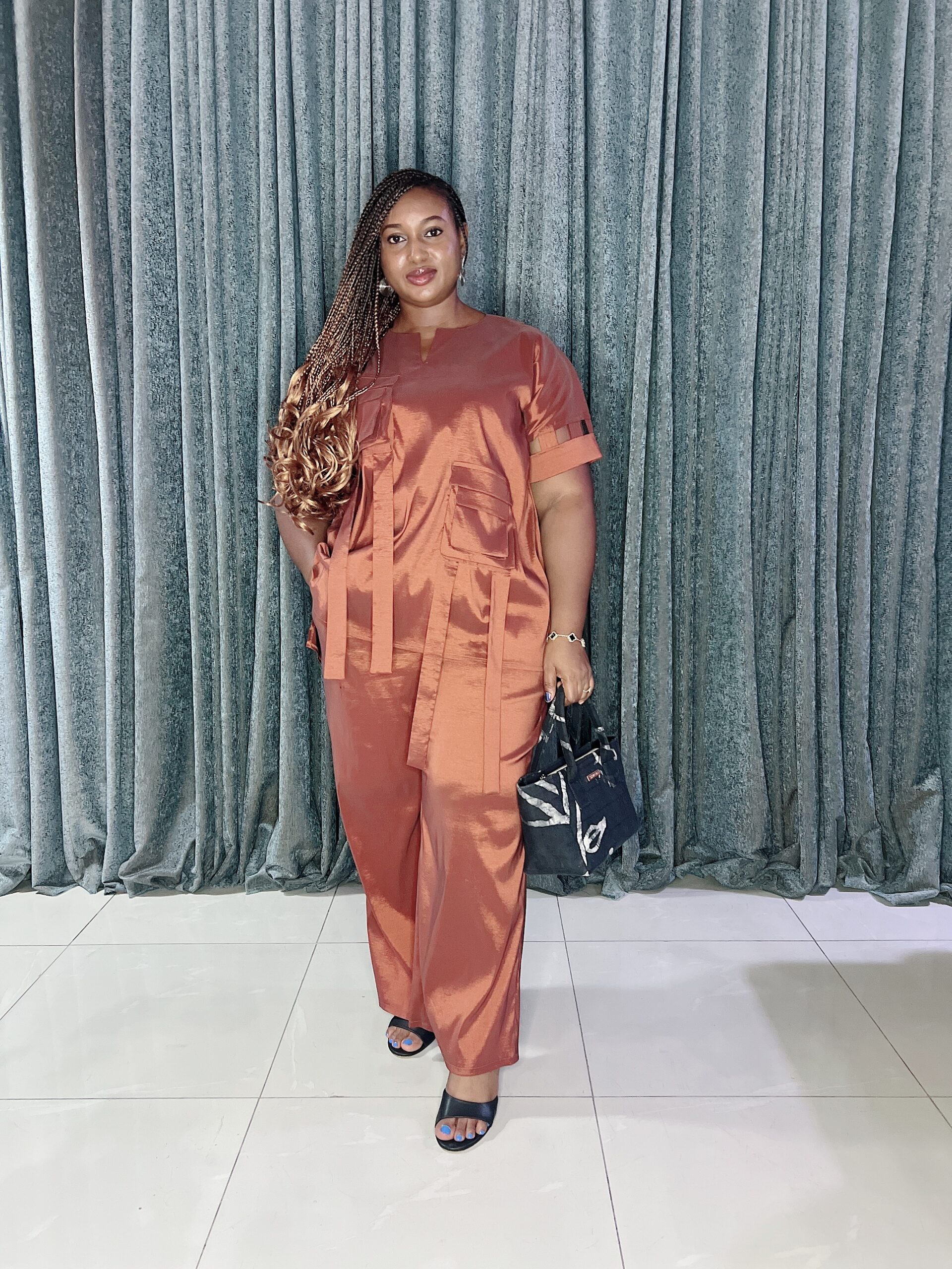 Hand beaded bodice and sleeve details with matching pants, comes with inner pockets.